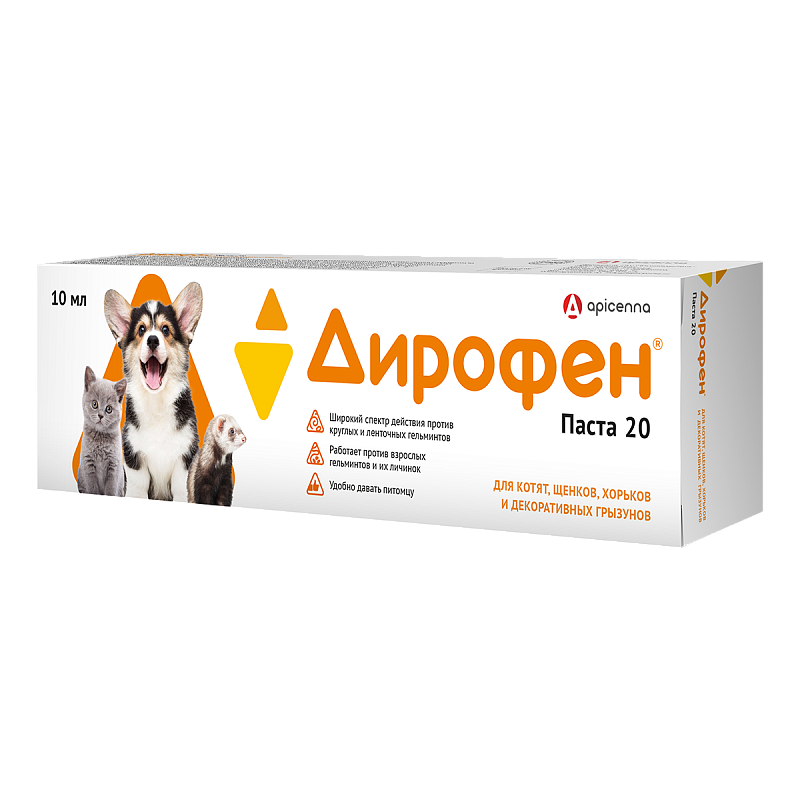 Дирофен-пасту 20 назначают котятам и щенкам с профилактической и лечебной целью при нематодозах (токсокароз, токсаскаридоз, унцинариоз, анкилостомоз), цестодозах (тениидоз, дипилидиоз, эхинококкоз, дифиллоботриоз, мезоцестоидоз) и смешанных нематодо-цестодозных инвазиях.
