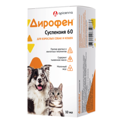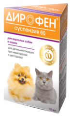 Дирофен-суспензию 60 назначают взрослым собакам и кошкам с профилактической и лечебной целью при нематодозах (токсокароз, токсаскаридоз, унцинариоз, трихоцефалез, анкилостомоз), цестодозах (тениидоз, дипилидиоз, эхинококкоз, дифиллоботриоз, мезоцестоидоз) и смешанных цестодозно-нематодозных инвазиях.